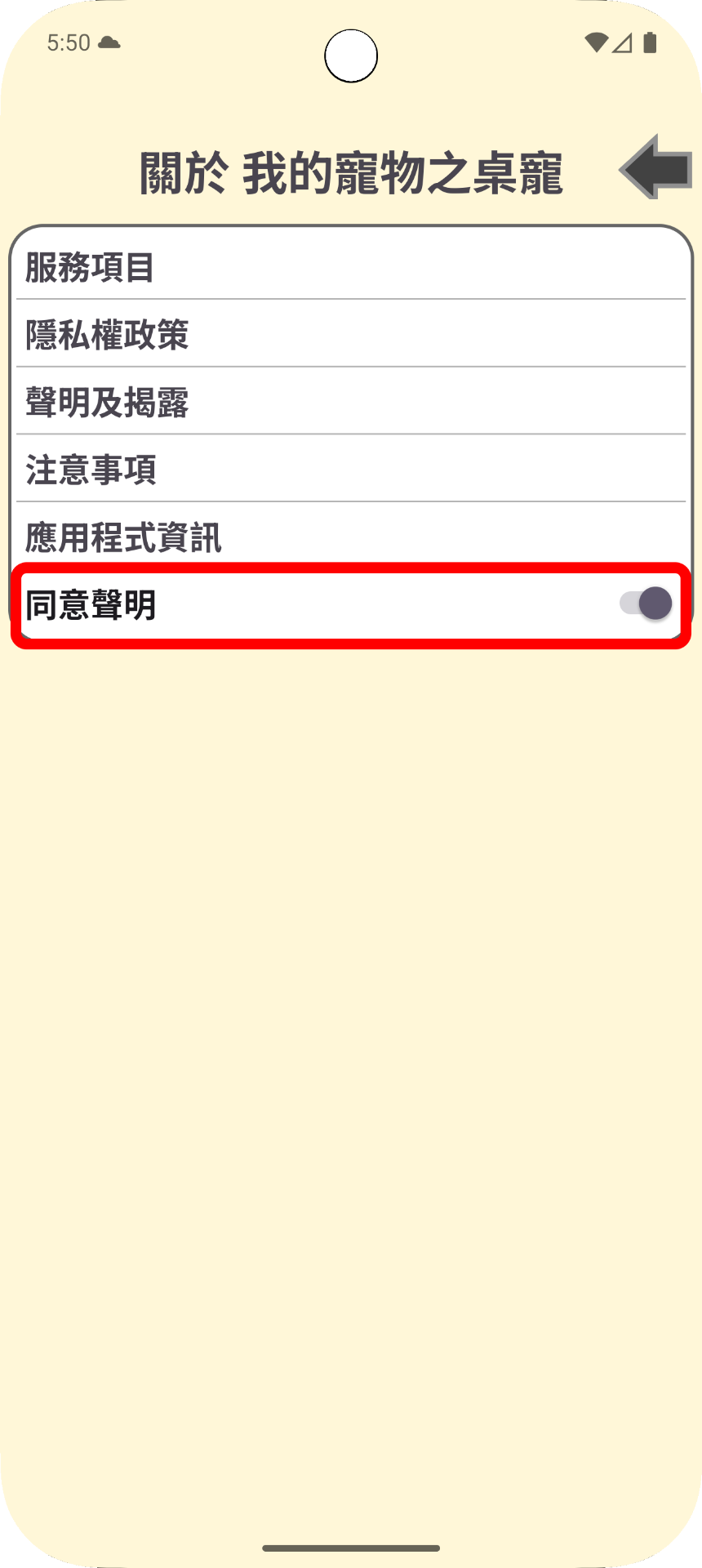 如果您需要取消同意聲明,可以在設定及其它內的關於頁面會有個聲明開關可以取消,一但關閉則立刻結束應用。