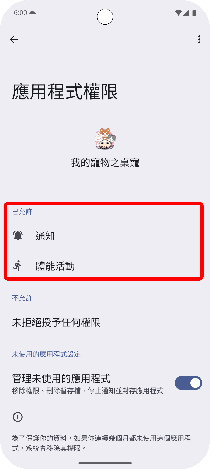 遊戲中「陪伴寵物散步」任務需使用感測器權限,以偵測背景行走步數,達成條件後方能完成任務。因此,體能偵測、前/背景服務與通知相關權限屬必要條件。